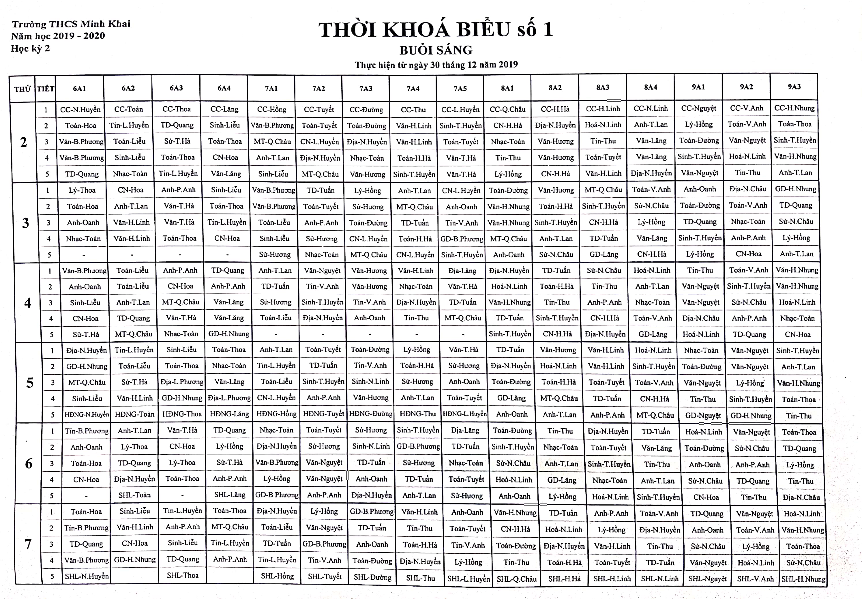 THỜI KHÓA BIỂU SỐ 1 NĂM HỌC 2019-2020